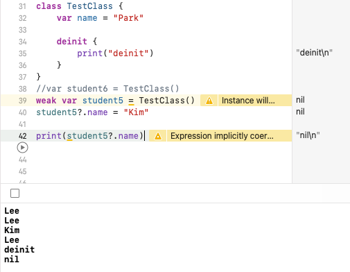 강한참조는 크게 이해할 부분은 없다. 기본적으로 우리가 생성하는 대부분의 클래스 인스턴스들은 강한 참조일 것이다. 선언할 때 특별히 뭘 적지 않는 이상 모두 강한참조이기 때문이다. 위의 코드에 있는 인스턴스들도 모두 강한참조이다.