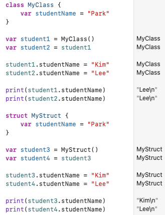 똑같은 형식으로 클래스와 구조체를 만들어줬다. 코드를 보면 student2 인스턴스는 student1 인스턴스를 '참조' 하고 있다. 쉽게 생각하면, student1과 2는 일종의 일심동체라고 보면 된다. 따라서, 1의 학생명은 'Kim'이라고 정의했지만 2에서 학생명을 'Lee'라고 재정의해줬기 때문에 프린트 결과문이 동일하게 나오는걸 확인할 수 있다.