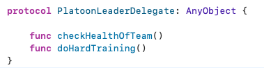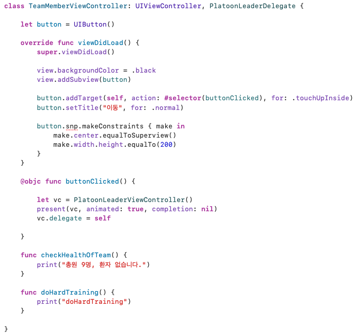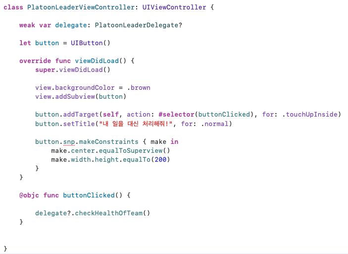 소대장 뷰컨트롤러를 보면 약한참조를 한 delegate라는 변수에 소대장 일 리스트 프로토콜 타입을 선언했다. 여기서 이 delegate라는 변수가 잘 이해가 안 갈 수 있는데, 먼저 약한참조를 해준 이유는 순환참조가 일어나 메모리 누수가 발생하는 경우를 예방하기 위해서이다(참고: 강한참조/약한참조 https://daltonic.tistory.com/27) 해당 변수를 만들어준 이유는 누가 소대장 뷰컨트롤러 객체의 어떤 일을 대신할지 정해주기 위해서이다. 코드를 보면 버튼이 클릭됐을 때, 소대장 일 리스트 중에서 팀의 건강체크를 대신 처리하게끔 해줬다.