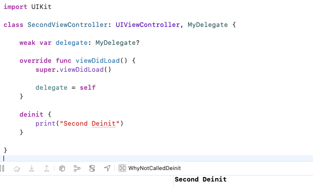 위와 같은 코드의 경우, 클래스 내에 프로토콜 타입의 변수 하나를 선언해줬다. 해당 변수는 현재 강한 참조를 하고 있기 때문에, SecondViewController를 강하게 붙잡고 있다. 이럴 경우에 SecondViewController는 더 이상 사용하지 않는 상황이 오더라도 강한 참조를 하고 있는 delegate변수 때문에 deinit이 호출 되지 않는다.