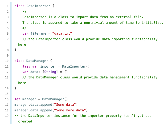 DataImporter라고 하는 클래스는 꽤나 복잡한 작업을 수행하기 때문에 초기화 하는 데에 적지 않은 시간이 걸린다고 가정해보자. 그런데 우리는 DataManager의 프로퍼티인 importer를 평소에 잘 쓸 일이 없어서 정말 필요할 때만 불러서 쓰고 싶다. 만약 이러한 상황에서 importer를 그냥 일반적인 저장 프로퍼티로 사용한다면, DataManager를 초기화하는 과정에서 DataImporter의 인스턴스도 마찬가지로 초기화해줘야 한다! 왜냐하면, importer가 DataImporter의 인스턴스를 가져야 하기 때문이다. 자, 그러면 우리는 자주 사용하지도 않을 importer 프로퍼티 때문에 안그래도 오래 걸리는 DataImporter를 초기화 하느라 과도한 메모리 낭비를 해버렸다.