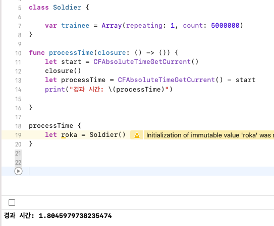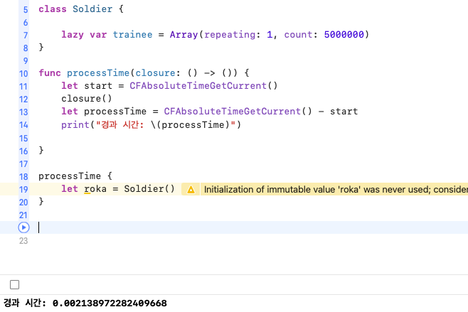 Soldier 인스턴스를 초기화하는 시간 차이가 극명하게 드러난다. trainee 프로퍼티가 시간이 오래 걸리는 연산을 하기 때문에 만약 지연 저장 프로퍼티로 만들지 않는다면 위 코드 처럼 trainee 프로퍼티를 당장 사용하지 않음에도 Soldier 인스턴스를 초기화 하는 시간 자체가 엄청 늘어나버리는 걸 확인할 수 있다. 이럴 때, 지연 저장 프로퍼티를 사용해줌으로써 효과적으로 대응할 수 있다.