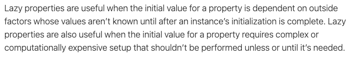 위의 예시 코드를 보면, 2개의 클래스 DataImporter, DataManager가 있다. 그리고 DataManager클래스의 프로퍼티 중에 DataImporter의 인스턴스를 가지는 지연 저장 프로퍼티가 있다. 해당 프로퍼티를 왜 지연 저장 프로퍼티로 사용할까? 이 부분에 대해서 스위프트 공식문서는 이렇게 설명한다.