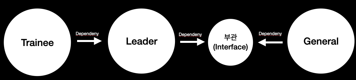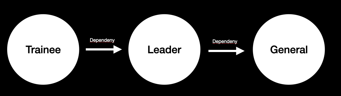 이럴 때, 우리는 의존성이 있다라고 말할 수 있다. 즉 훈련병 클래스는 리더 클래스에게 의존하고 있고 리더 클래스는 장군 클래스에 의존하고 있다.