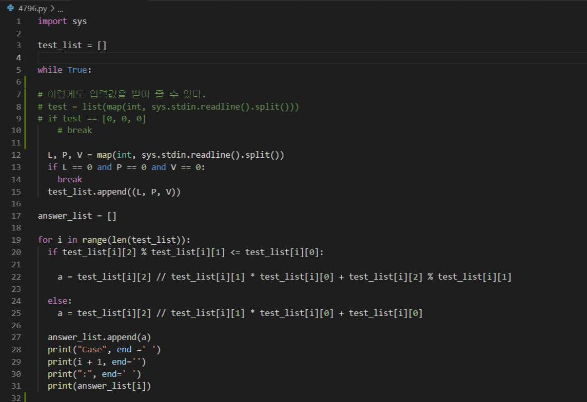 1. 처음에 입력값을 받을 때, [0, 0, 0]을 입력받을 때까지 계속해서 입력을 시켜야 하는데 이 부분을 잘몰라서 애를 먹었다. 결국 떠올린게 while문과 if문을 활용하는 거였는데, 다행히 올바르게 작동했다. 다른 분들 코드를 참고해보니 이렇게 간단하게 몇 줄로 표현하는 방법도 있다.